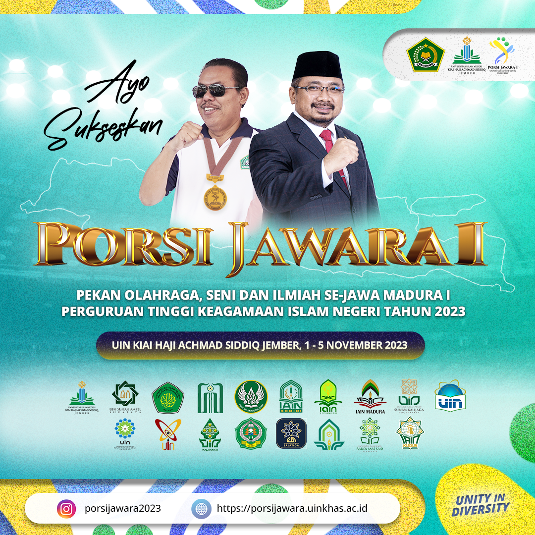 Puji syukur kehadirat Allah Yang Maha Kuasa senantiasa kami panjatkan, atas berkah rahmat dan hidayahnya kami dapat menyelenggarakan Pekan Olahraga, Seni, dan Ilmiah Se-Jawa dan Madura atau disingkat PORSI JAWARA kesatu tingkat Perguruan Tinggi Keagamaan Islam Negeri (PTKIN) di UIN Kiai Haji Achmad Siddiq Jember. PORSI JAWARA merupakan usaha bersama PTKIN se- Jawa dan Madura dalam mencerdaskan anak bangsa melalui kegiatan akademik maupun non akademik. Terlebih, berkaitan dengan kesehatan jasmani maupun rohani, serta mental spiritual yang tumbuh maksimal mengiringi proses pendidikan. Mahasiswa masa depan diharapkan menjadi pribadi cerdas secara intelektual, moral-spiritual, emosional dan sosial. Hal ini sebagai komitmen dari pemegang kebijakan di tingkat kementerian hingga insan akademik pada pendidikan tinggi untuk meningkatkan kualitas mahasiswa baik dari sisi akademik maupun non akademik. Selamat berkompetisi, mari berpacu dengan sklill serta berpadu dengan sportifitas dan persahabatan.