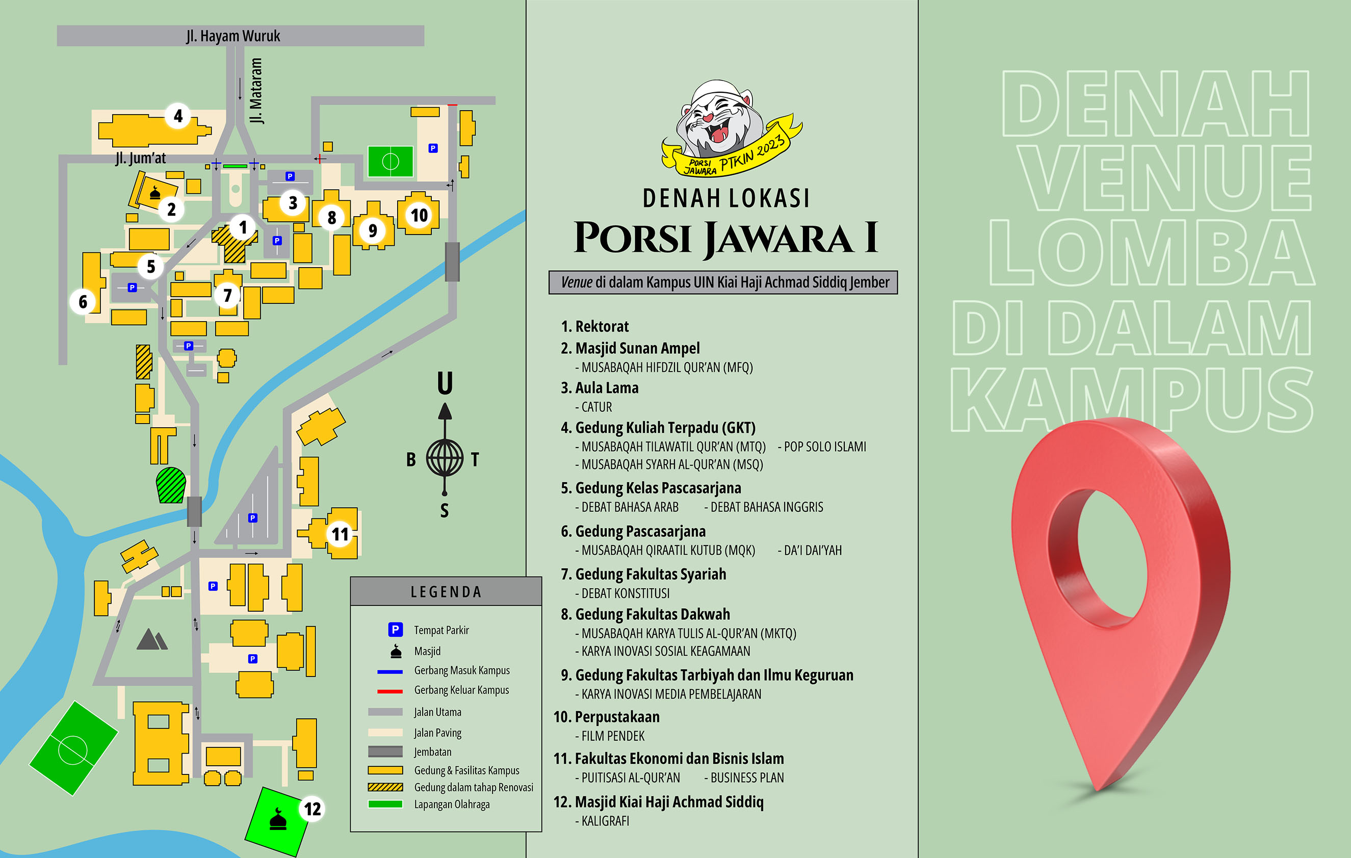 Puji syukur kehadirat Allah Yang Maha Kuasa senantiasa kami panjatkan, atas berkah rahmat dan hidayahnya kami dapat menyelenggarakan Pekan Olahraga, Seni, dan Ilmiah Se-Jawa dan Madura atau disingkat PORSI JAWARA kesatu tingkat Perguruan Tinggi Keagamaan Islam Negeri (PTKIN) di UIN Kiai Haji Achmad Siddiq Jember. PORSI JAWARA merupakan usaha bersama PTKIN se- Jawa dan Madura dalam mencerdaskan anak bangsa melalui kegiatan akademik maupun non akademik. Terlebih, berkaitan dengan kesehatan jasmani maupun rohani, serta mental spiritual yang tumbuh maksimal mengiringi proses pendidikan. Mahasiswa masa depan diharapkan menjadi pribadi cerdas secara intelektual, moral-spiritual, emosional dan sosial. Hal ini sebagai komitmen dari pemegang kebijakan di tingkat kementerian hingga insan akademik pada pendidikan tinggi untuk meningkatkan kualitas mahasiswa baik dari sisi akademik maupun non akademik. Selamat berkompetisi, mari berpacu dengan sklill serta berpadu dengan sportifitas dan persahabatan.